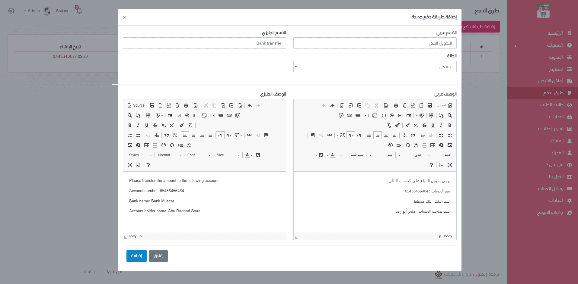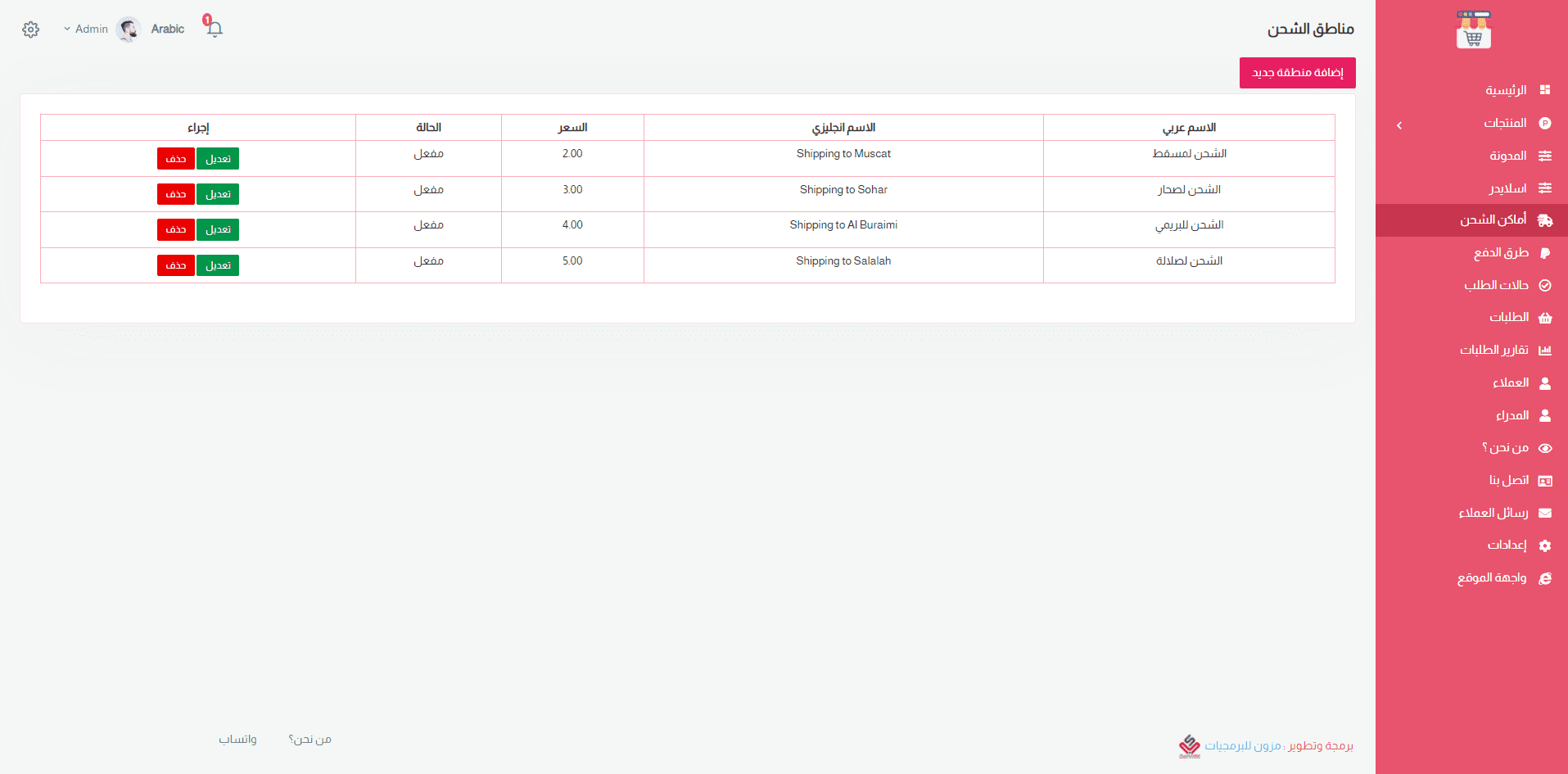 يمكن للأدمن المتجر إضافة مناطق الشحن ويمكن اضافة مبلغ الشحن مع كل منطقة وايضا يمكن تفعيل المنطقة او لا - ويتم اضافة مبلغ الشحن اختيار العميل للطلب