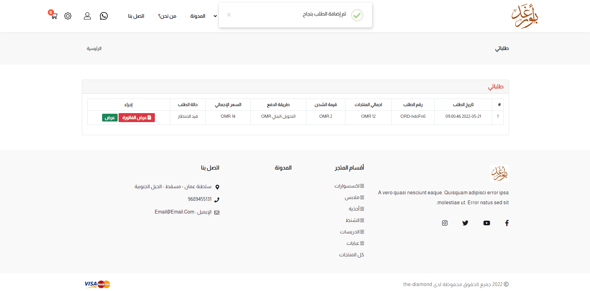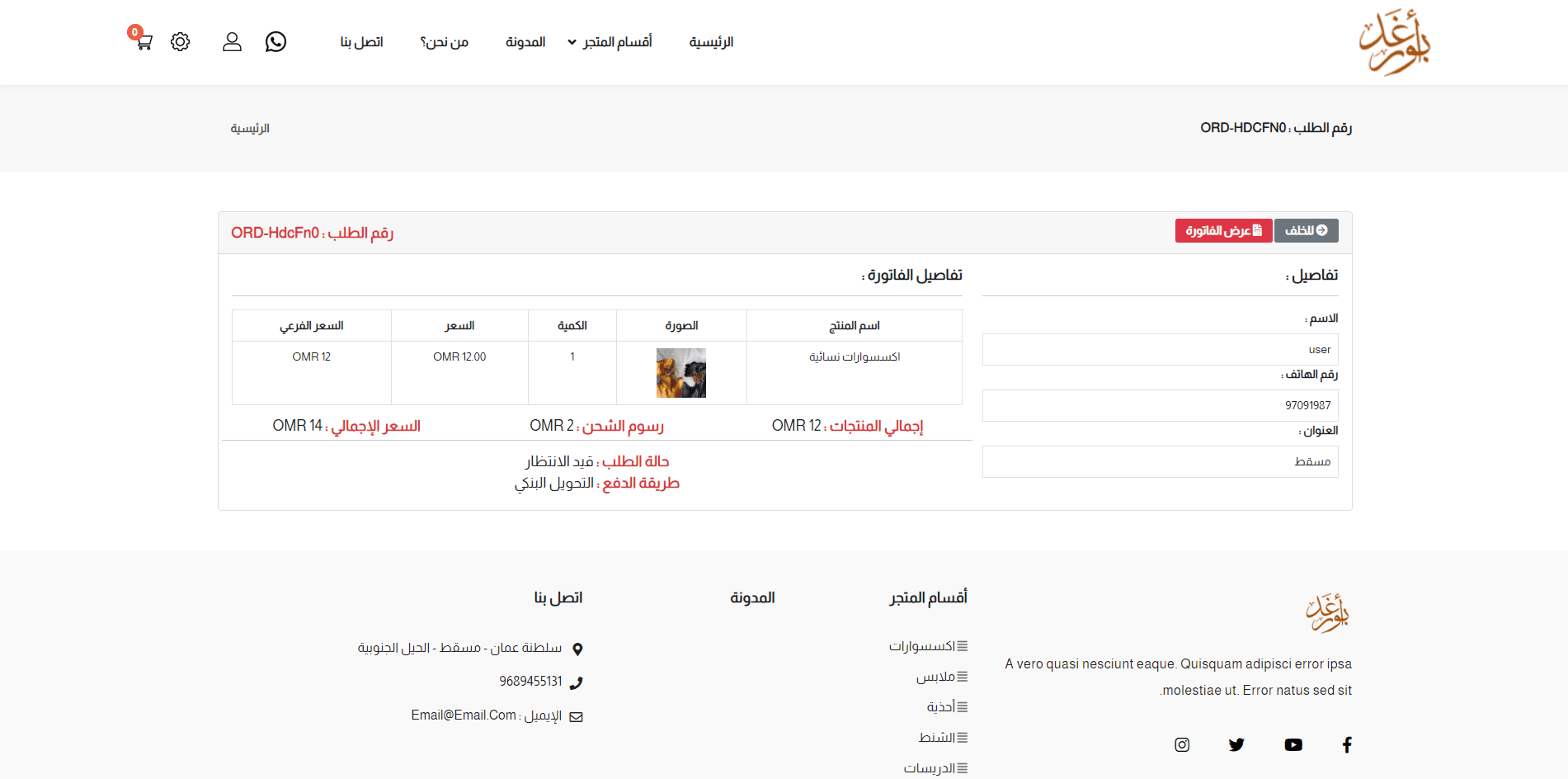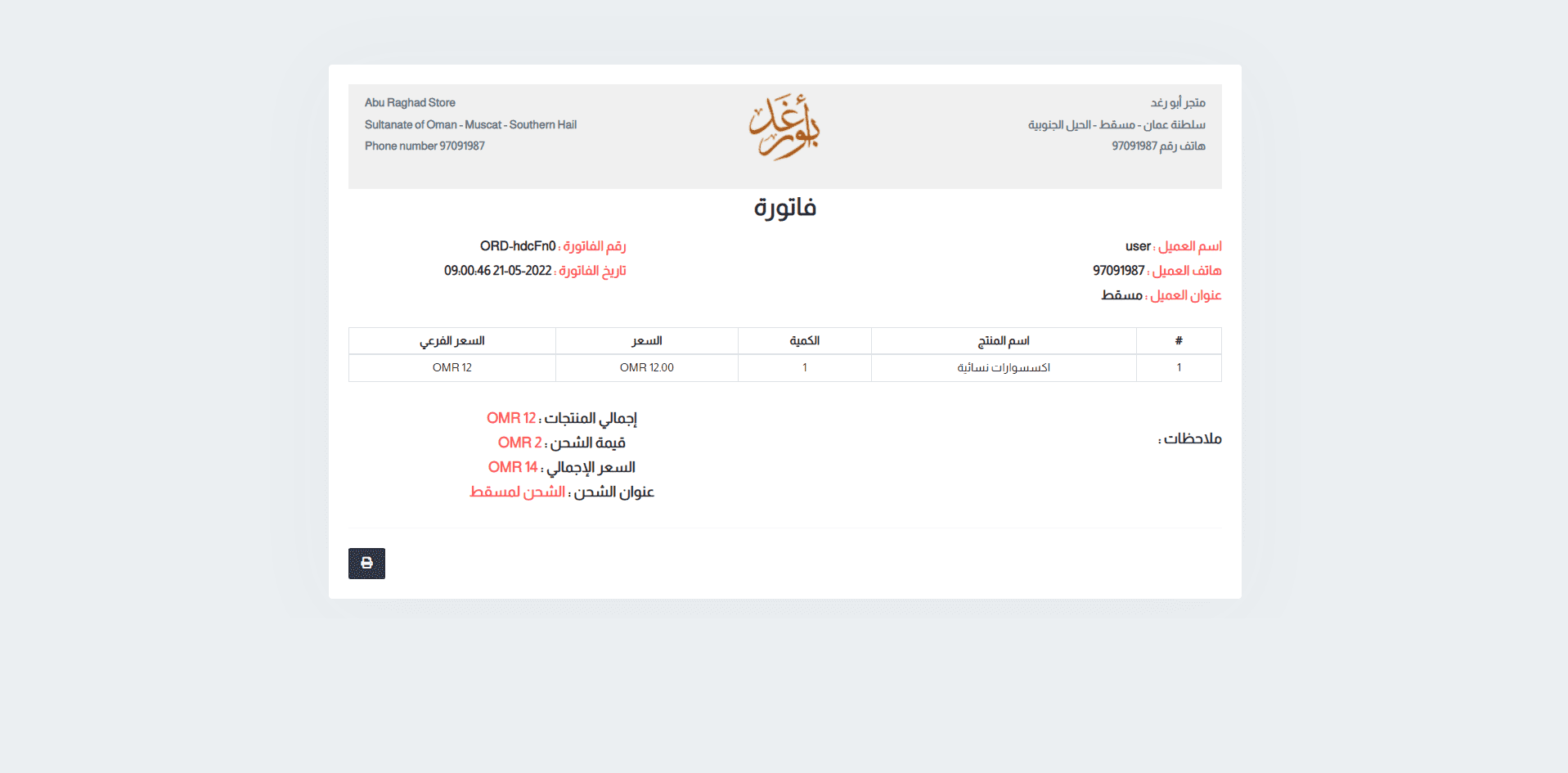 عندما يقوم العميل بعمل طلب من المتجر يمكنه طباعة الفاتورة الإلكترونية وايضا الأدمن يمكن طباعة الفاتورة الإلكترونية ويظهر فيها كافة التفاصيل